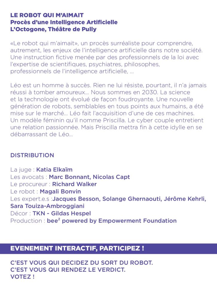 « Le Robot qui m’aimait », un procès surréaliste pour comprendre, autrement, les enjeux de l’intelligence artificielle dans notre société. Une instruction fictive menée par des professionnels de la loi avec l’expertise de scientifiques, psychologues, philosophes, professionnels de l’intelligence artificielle, …